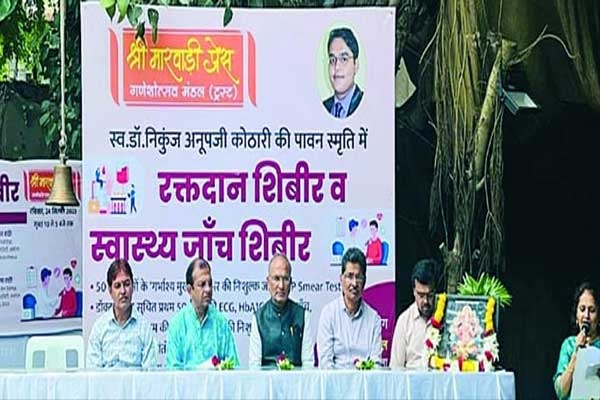 Blood camp : येथील मारवाडी प्रेस गणेशोत्सव मंडळातर्फे मंडळाच्या प्रांगणात रविवार 24 सप्टेंंबर रोजी रक्तदान व आरोग्य तपासणी शिबिर राबविण्यात आले. या दोन्ही शिबिरात नागरिक व युवकांनी उत्स्फूर्तपणे सहभाग घेत हे शिबिर यशस्वी केले.या शिबिरात 234 नागरिकांनी रक्तदान केले. स्व.निकुंज कोठारी यांच्या स्मृतीत आयोजित या रक्तदान व आरोग्य तपासणी शिबिरात आयएमएचे अध्यक्ष डॉ.संदीप चांडक, डॉ. अनुप कोठारी, डॉ. अमरीश खटोड, डॉ.आशिष डहेणकर, प्रकल्प प्रमुख अनिल राठी, पराग शाह, पंकज तापडिया, सुशांत राठी, नंदकिशोर बाहेती आदी मान्यवर उपस्थित होते. शिबिरात 234 नागरिकांनी रक्तदान करून आपले दायित्व पार पाडले. त्यांना प्रशस्तीपत्रे बहाल करण्यात आली. रक्त संकलन हेडगेवार रक्तपेढीचे डॉ. समीर देशमुख व त्यांच्या वैद्यकीय चमूने केले.